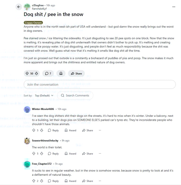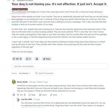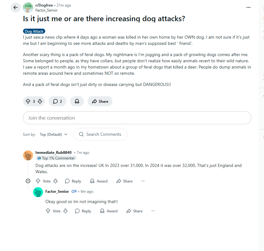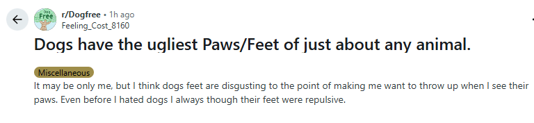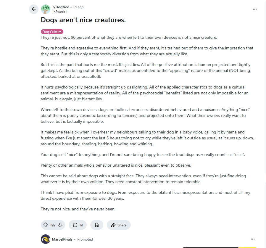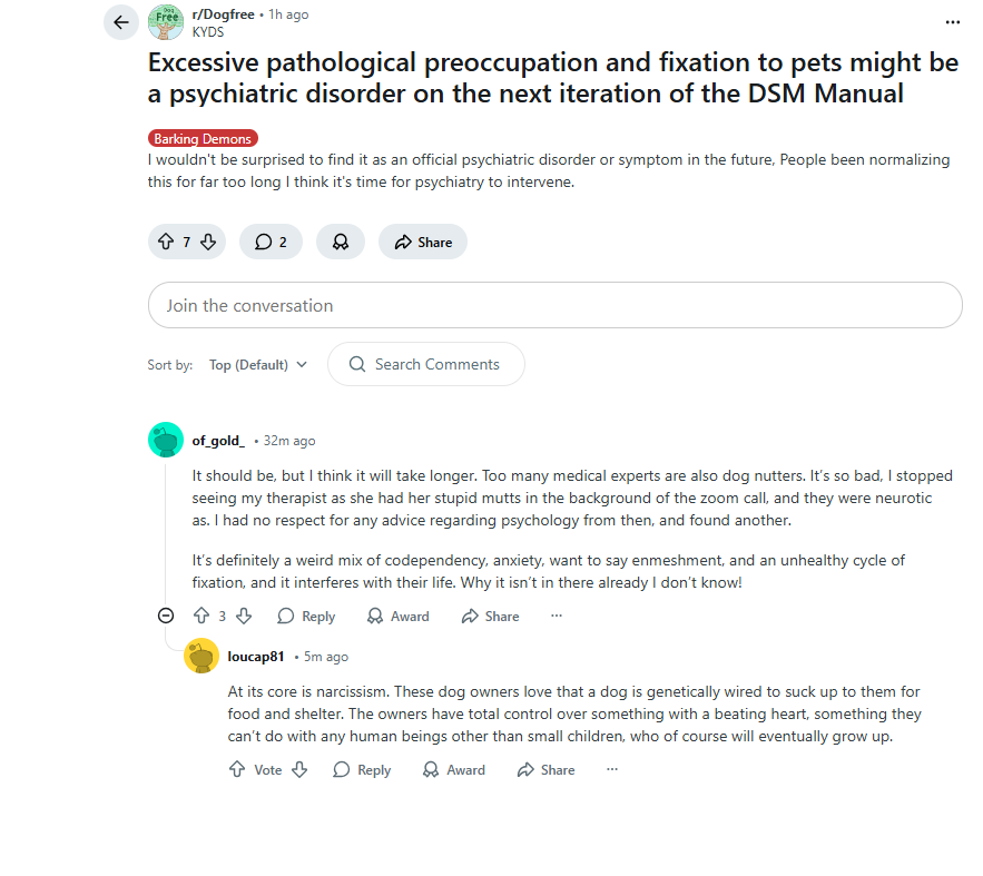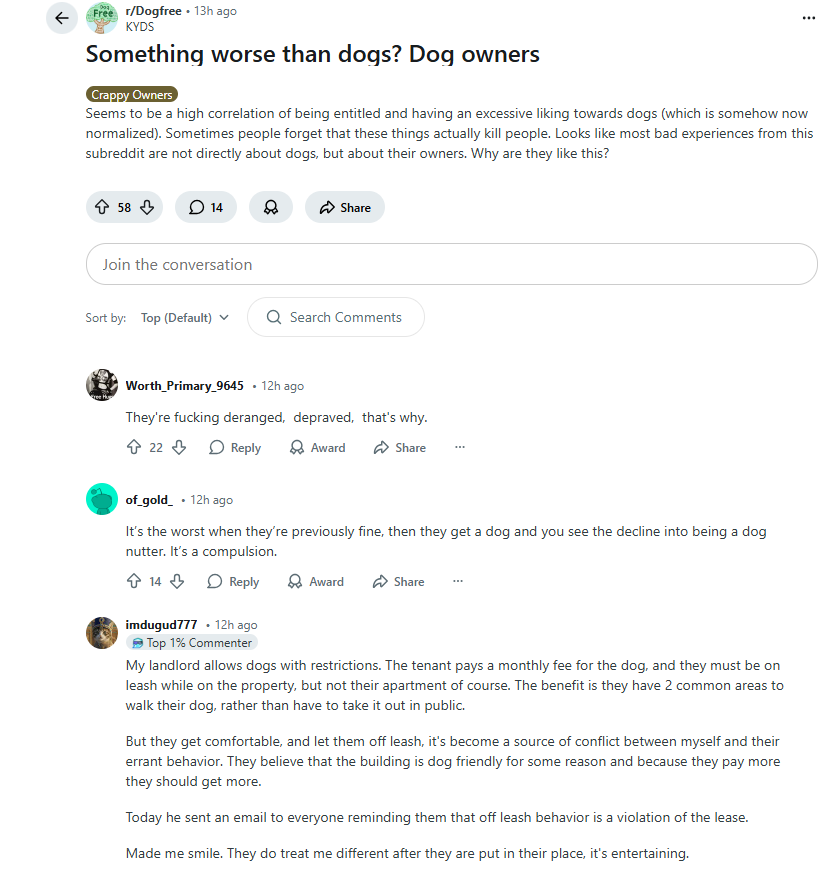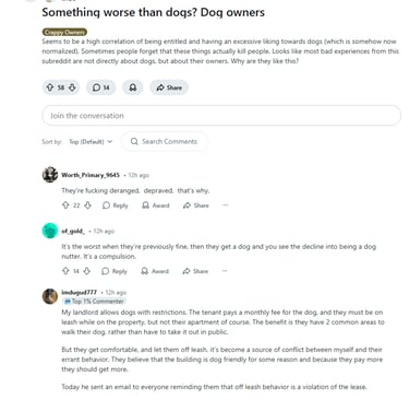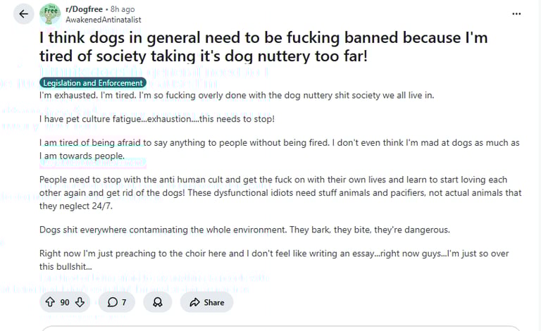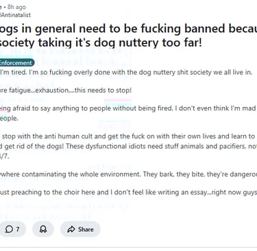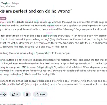 It is the writer's opinion that the percentage of human beings who suffer from this form of anxiety about dogs is far higher than what the screenshots suggest, far higher. And they do not need therapy, medication or any kind of cognitive readjustment. The corporation called the United States is going to provide these people living conditions free of dogs. It is quite normal to feel nervous around something that is nothing short of a weapon, an unpredictable weapon at that. The corporation called the United States caters to all kinds of groups, allow all kinds of protective classes for any group that demands it, and having the option and right to live free of dogs and dog culture is no different, no different at all.