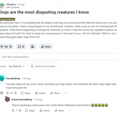 People on Reddit are shocked at how evil, cruel, sadistic and degenerate dog worshipers are in relation to the blood thirsty violence and murder done by man's worst enemy. Nothing shocking to me though, this is the DIRECT result of the mutt mind brain parasite installed into humans by the four legged plague. Once these parasites have been fully ensconced into your synaptic pathways, you are under complete dominion of the four legged plague and slowly morph more and more into one and these comments prove it.