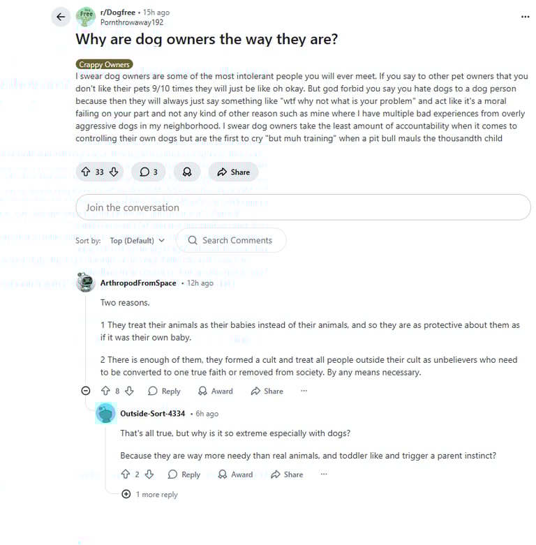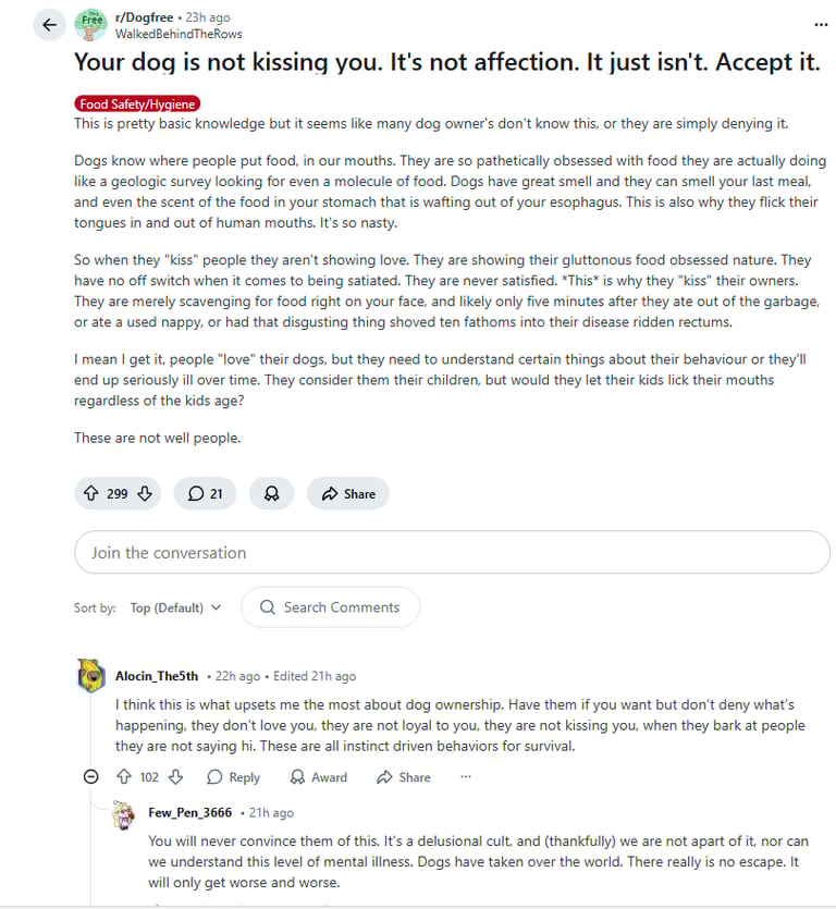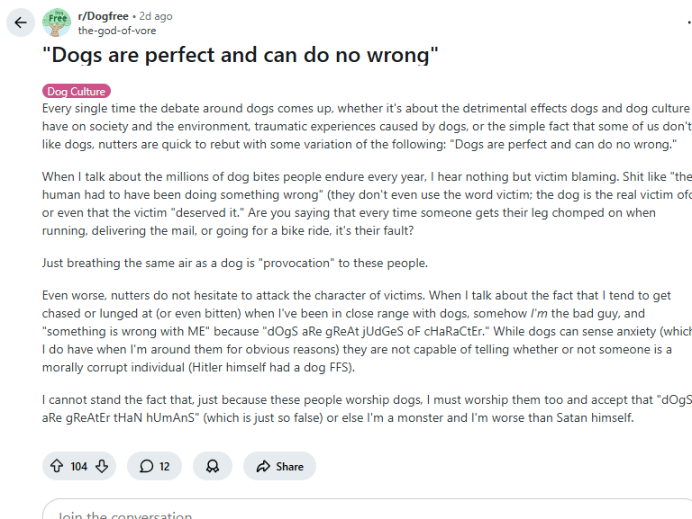 Over time I have noticed that some of the dog critic channels recently and not so recently tend to engage in conversation and dialogue with the demographic who own dogs, love dogs, worship dogs or visit and comment on dog worshiping sites. It is my opinion that this is a terrible mistake and quite the futile approach, even though many of the dog worshiping crowd comment on the anti-dog channels and successfully troll and get people to react. No amount of logic, statistics, valid points, or arguments, video footage is going to bring a dog lover out of their usurped state, it is just not going to happen. Instead, what happens is any attempt at a rational, calm or logical discourse quickly disintegrates into a very negative, hostile and at times threats of violence from the dog loving crowd. The solution in my opinion is to never engage a dog worshiper, they have a right to feel any way or process dog ownership in whatever form or fashion they desire, no matter how irrational or absurd. Giving this group nothing to attach to and move right around their presence and dialogue is key. Take the plan and organize and petition the corporation called the United States without any involvement from the dog culture crowd.