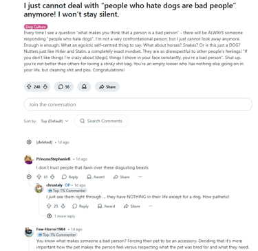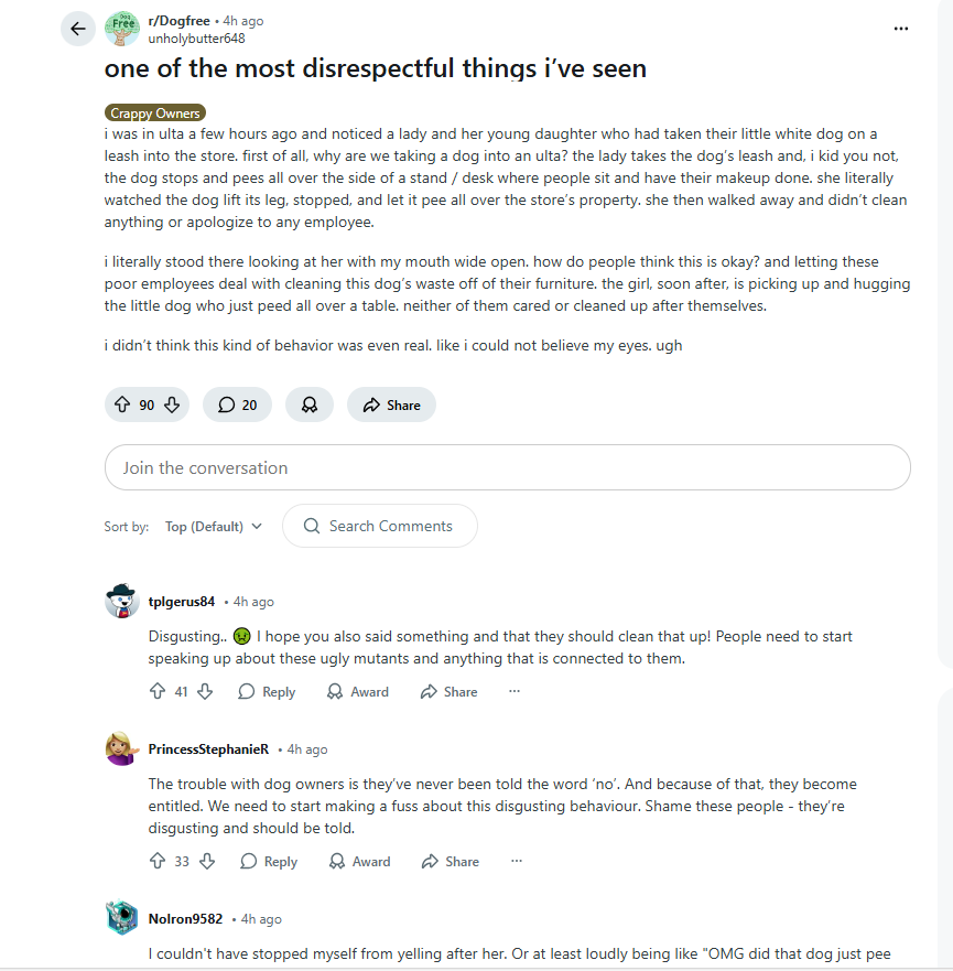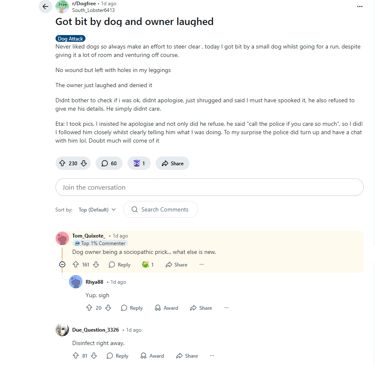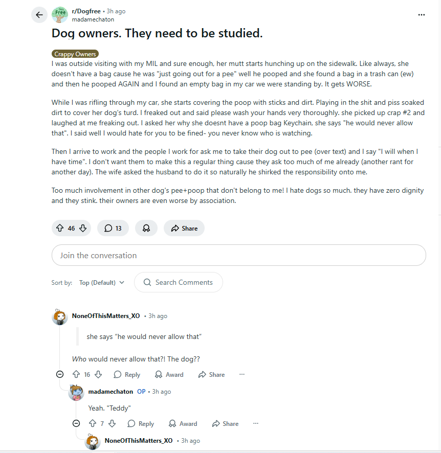 These people are truly one of the most antisocial groups and demographic there is today. They represent unsophistication, no class, no respect, violence, filth and they behave in an overwhelmingly fashion across the board as two legged dogs. You will see them being very aggressive, loud, abrasive, reactive and seeking attention from anybody who will look their way. They are desperate for it, these people are mentally ill in a majority of instances, and the acquisition of a mutt only enhances and furthers their mental dysfunction. Dog ownership is a sure and absolute sign that something is wrong with headquarters.
