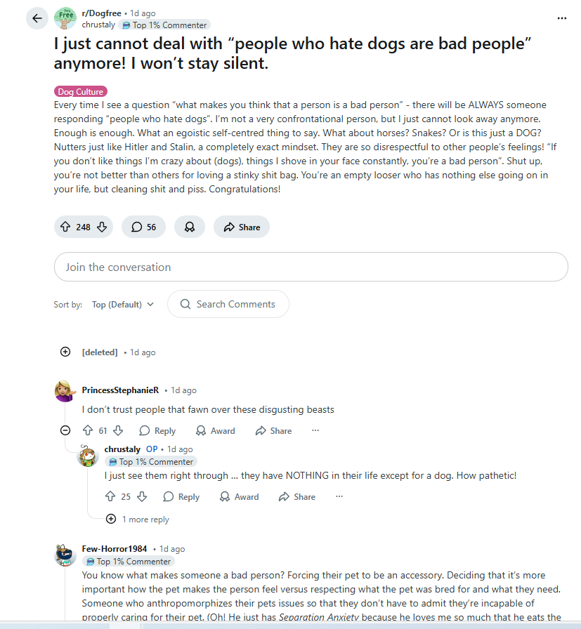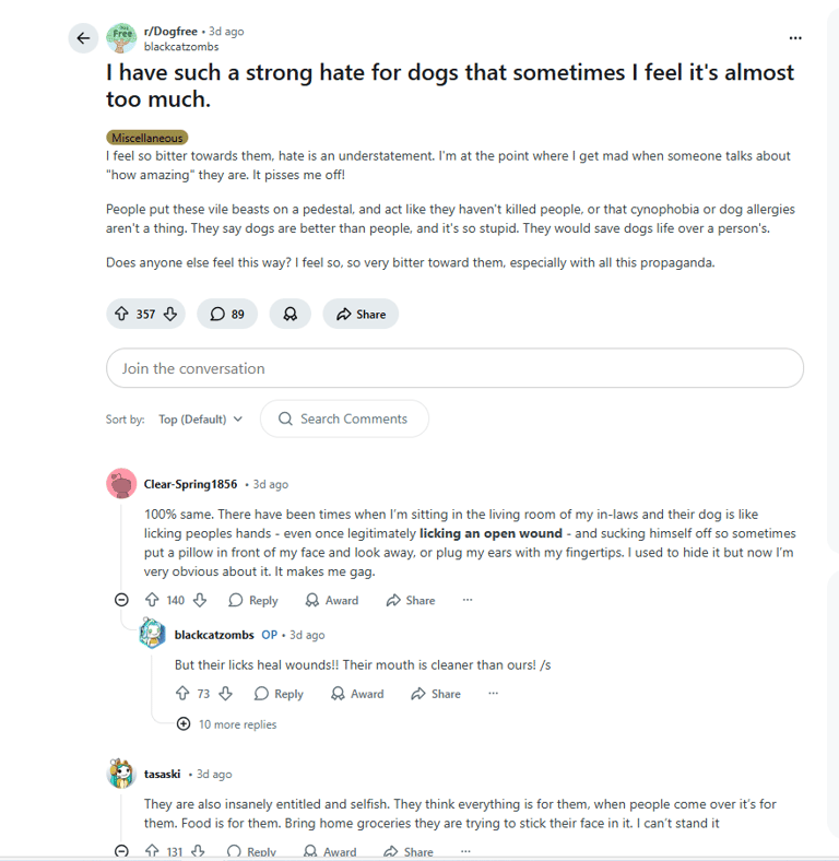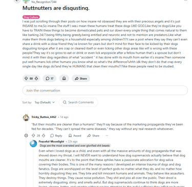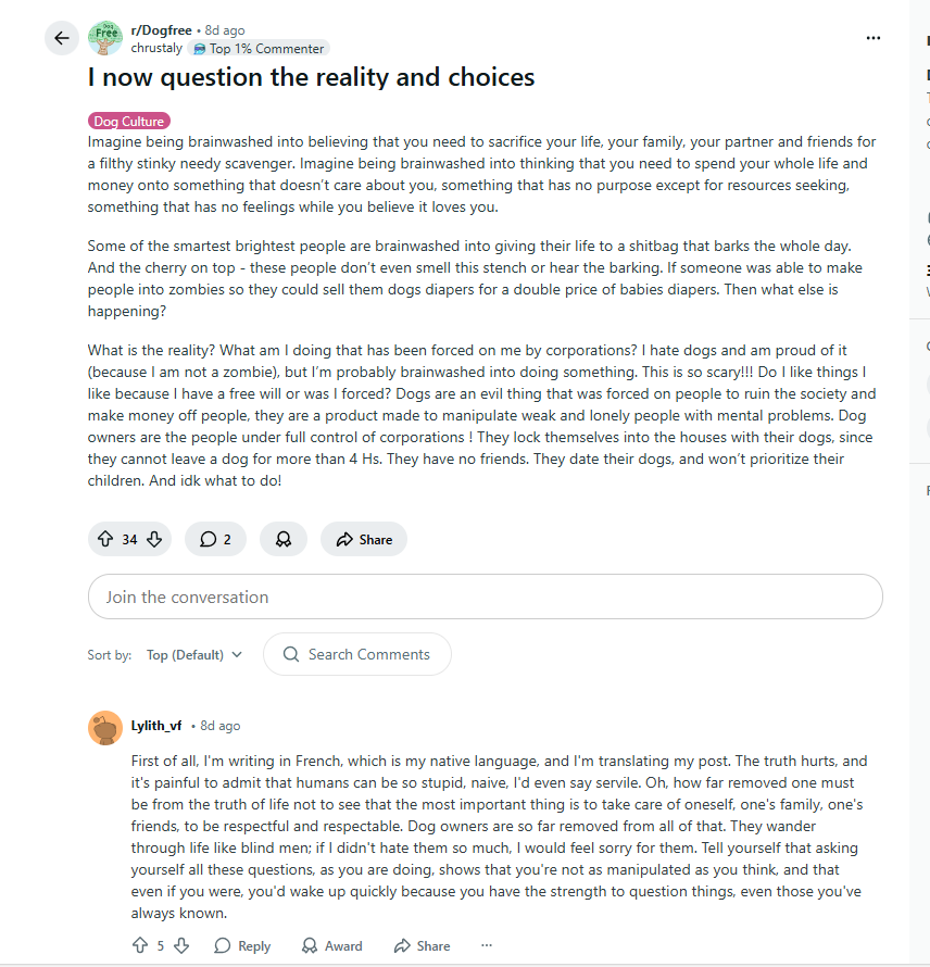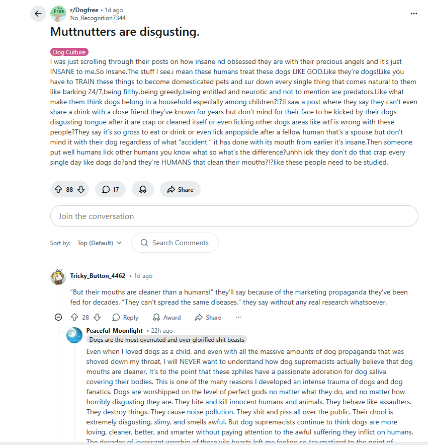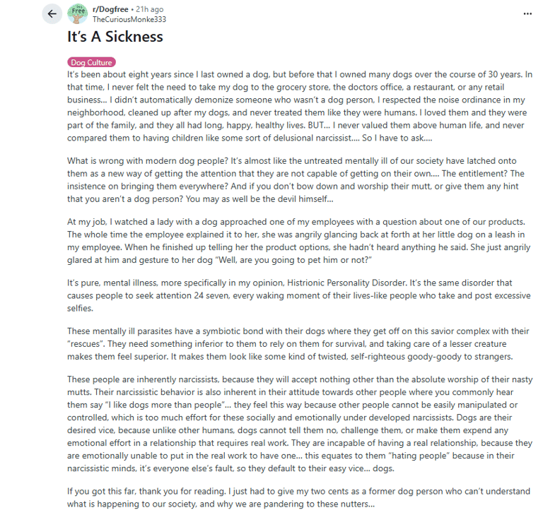 The video below to the right is a very interesting and important discussion. The content creator talks about a man who was brutally savaged by murder mutts. This man was seriously disabled, lost his job and was permanently damaged. He had gone on social media after the attack and was complaining about the situation and dog culture in general, when he quickly realized that there was NO sympathy, concern or empathy for him. Quite the opposite actually, he was attacked savagely by dog worshipers who said he was the problem, and the dog was the victim. There was a sustained campaign against him on all fronts as to the attack, defense of the dog and how he was at fault and the dogs were innocent. So, he began to research why this phenomenon exists in dog culture and why dog worshipers hate humanity in general and cling to very anti-social and anti-human precepts and tenets.