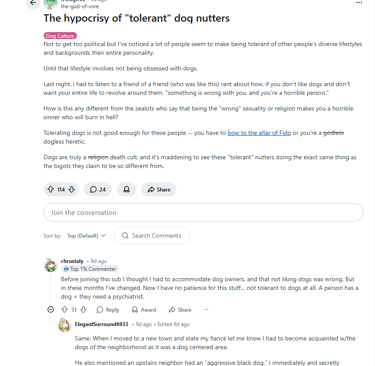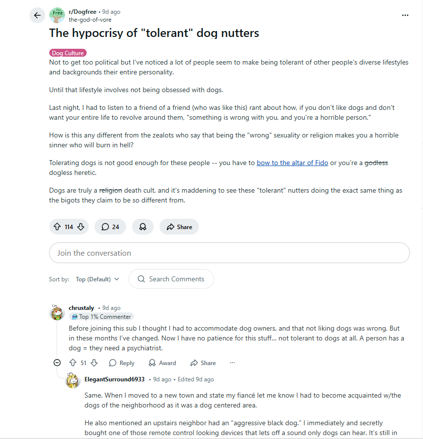Check out dog culture, and both four legged mutants and two-legged violent dogs, the mutt mind brain parasite in all its uncivilized ugliness. Dog free cites NOW.