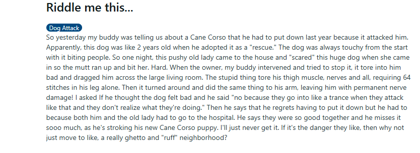 A dog owners' creed and primary directive, to terrorize the public and get sadistic pleasure from it. And all dog owners have jedi mind control over their murder mutt.