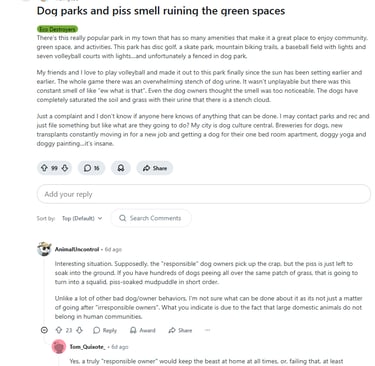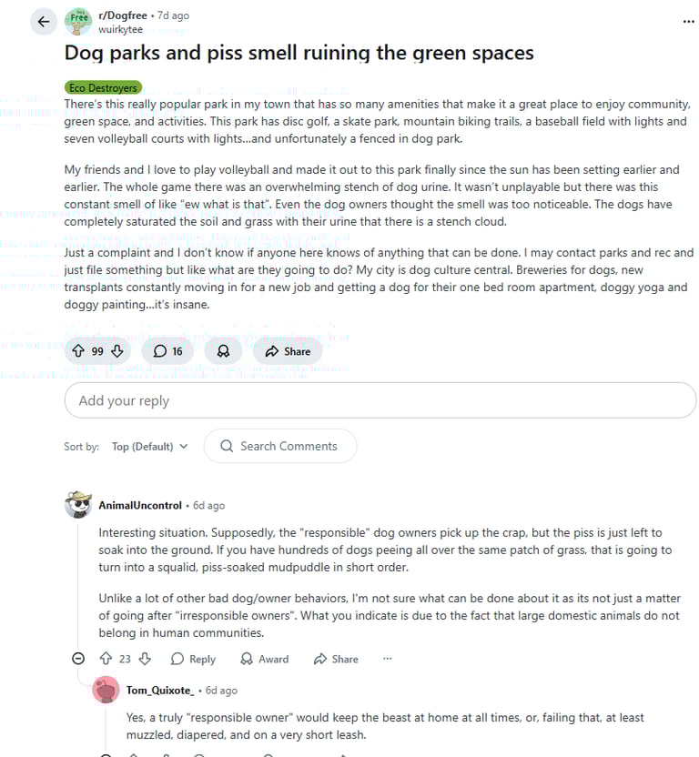 Work for dog free cities and communities, to be free of these four legged cockroaches and their deranged dirtbag owners controlled by the mutt mind brain parasite.