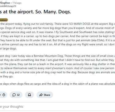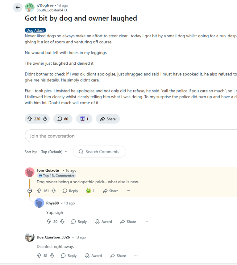 Nobody gives a flying .... what a dog owner has to say about their dog and what it will and will not do. To someone who does not want to be anywhere near a dog, what the dog owner has to say is meaningless. It is no different than a twenty-five-year-old man walking down the street with a shirt that says, "I'm one of the good guys" with an assault rifle strapped to his chest. Twenty phone calls to 911 would be carried out in seconds upon seeing this threat, and the cops would be onsite within seconds with weapons drawn screaming, "Drop the weapon or die" and this man's shirt or anything he has to say is completely meaningless, just as it is with the dog owner and their tired worn meaningless mantra.