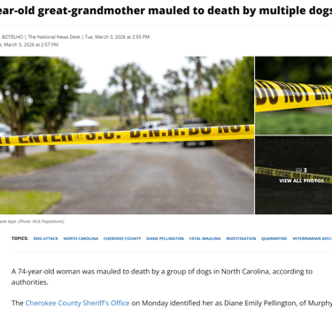 71-year-old woman butchered by dogs on her own porch. Dogs are man's worst enemy with not even a close second. Work for an advocate for dog free cities, so we can live free of this blood ritual death cult of violence and murder. Take a good look at what the mutt mind brain parasite does to owners of these vile beasts.