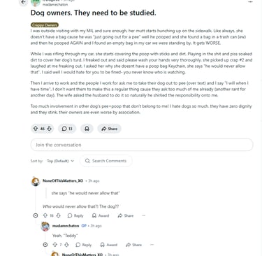 Most people have lived in an apartment, condominium complex or somewhere that shares a community where people live in close proximity to each other. And of course, there will be lots of dog addicts. And the interesting thing is that you can see a very nice outer exterior of a home, apartment or building, but if there is a dog living there, it is a contaminated barn inside, there is no exemption to this fact. There is always a field or dirt area, or trail, park or some area next to or adjacent to the living area, and every single dog addict who lives you will see walking their four-legged drug to that very area so it can poison, contaminate and destroy the area for all who might like to use it. Every dog owner does this, and once an area is established as the local toilet for the four-legged vermin, the area will be a level four biohazard. And there is no exception to this and dog ownership and dog culture.