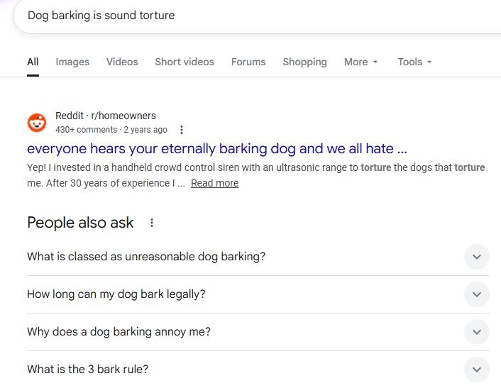 Barking has to be the most unnatural sound there is and it is most definitely sound torture for any human being, with varying degrees of sensitivity as all human beings are unique and different. That noise that man-made mutants make is not natural, not from nature, nor is it the normal behavior of a natural animal. You will find no other natural animal doing this. No matter what excuse any expert or behaviorist gives and says, the barking noise is sound torture and is the most systemic and problematic noise pollution for any community where human beings live. I have been in dog worshiping homes where the owner of these mutants has snapped off because their own mutts drive them into insanity. If you go on Google and search on "What is sound torture", the computer on the top floor will quickly offer its definition of the same, but if you search on "Dog barking is sound torture", very predictably the same computer on the top floor has no response, no comment, and no opinion on that truth. Go figure that and the reason why is because it is anathema to criticize dogs and the cult of dog culture. When the option exists to live in dog free cities, communities and territories, there are millions who are going to take advantage of that.