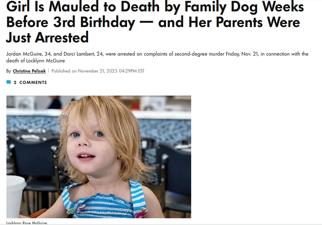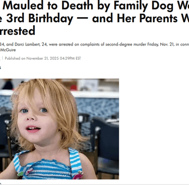 Fur baby executes little girl, experts say girl caused her own murder. Dog was scared but is now resting comfortably. Four-year-old little girl slaughtered by a dog. Cold blooded murder of an innocent child. It's a dog's world, were just living in it. On with the body count. Dog will be ready to murder again in short order.
