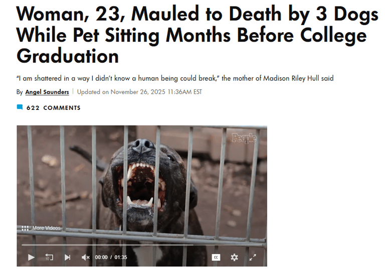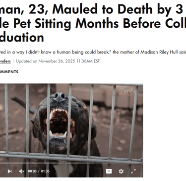 Frankly, I am tired of seeing and hearing about human beings butchered by dogs and I want it to stop, permanently. If the reader wants to get an idea of what a lethal mauling or dog attack would look like, watch the original movie, The Island of Dr. Moreau as it gives some very realistic depictions of what it would look like at the end of the movie.