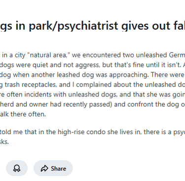 Several times I have had dog owners with their dog off leash and approaching me, and I have to tell them, keep that dog away from me, and they respond with "Oh the worst he will do is jump on you" and I have to inform them that that is precisely what I do not want. This is the attitude of a large majority of dog owners as they feel compelled to behave as if the entire area they live in is their personal front room and any and all behavior that they do with their dog is fine with everybody. Another time coming out of an auto parts store and a woman and her dog off leash walking through the area as if they owned the place. The dog was carrying a tennis ball and began to wander toward me, I informed her keep that dog away from me, and she was watching the dog with delight anticipating I was going to carry on with joy and gush over her dog. I didn't and her response was anger telling me, "He just wants to play" As strange as this is, this is extremely common with many dog owners as they operate in society with the attitude that because they love their dog, the entire population loves their dog. Very selfish, entitled and arrogant behavior.