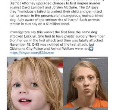 Where were you CPS? WORTHLESS. Two arrests for second degree murder for baby Locklynn. Dog free cities NOW to be free of this despicable grotesque culture of dog ownership and worship. Pure unabashed diabolical incarnate evil. Why did you murder my baby? I thought you were a member of my family and my little girl's sibling, we loved you, fed you, and took care of you. Because I am a blood thirsty killer that kills for sport, and my specialty is murdering babies, infants and toddlers. I hate all human beings, and I am man's worst enemy and you knew this you stupid mother ....... Now your both going to prison for a long time and your baby is dead, murdered all because you trusted and worshiped a violent murderous beast like me. Deplorable and PATHETIC. Take notice dog moms, but I know, YOUR dog would never do this.................